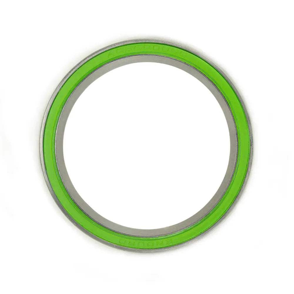 The Enduro line of angular-contact headset bearings start with Black Oxide treated Chromium Steel races, steps up to full 440C stainless steel, and the top of the line is, lifetime-guaranteed, XD-15 aerospace-stainless (races and balls). They are always engineered with the largest balls possible, feature dual-lip seals riding in a micro-groove (labyrinth) and are filled 90% with high pressure water proof grease for the ultimate protection against sweat and the elements. Enduro Angular Contact (A/C) bearings are designed so all balls are evenly engaged to spread the force over a larger surface area, minimizing wear and maximizing life.