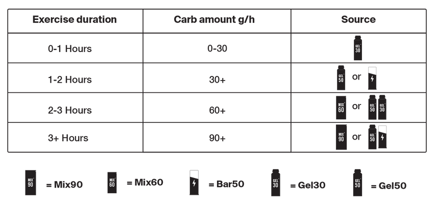 During intense activity carbohydrates are your body’s primary energy source and more can be absorbed per hour when they come from dual sources. As a rule of thumb you should be aiming for around 30-60g of carbs per hour for activities of 1-3 hours and 90-120g of carbs per hour for any activities over four hours. This will of course depend on your individual size and weight. We recommend training your gut and using our Fuel-Tool to help calculate a fuelling guide for your needs.