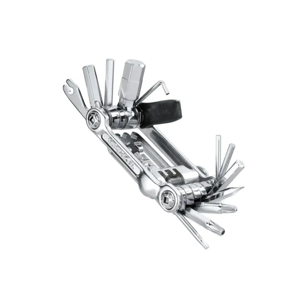 A precision full metal 23 function mini tool made to handle any road or trailside repair. T10 and T25 Torx wrenches simplify hydraulic disc brake work. Includes self-tightening tool and a neoprene bag. The perfect tool for endurance racing, training and touring.