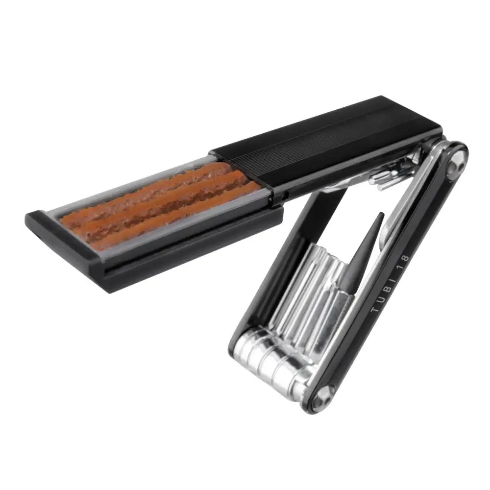 18 function, pro-quality, precision mini tool with integrated tubeless tire repair functions. Tubeless repair tools and tire repair plug compartment store inside the tool body for a streamlined profile. Perfect for any road or trailside repair.