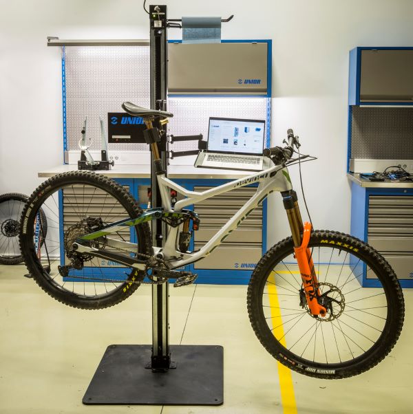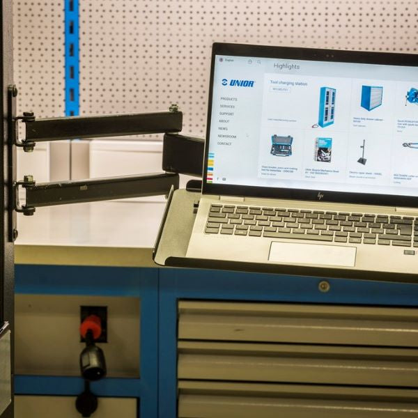 Foldable laptop holder mounts to the Union’s electric repair stand column and provides optimal placement for laptop. The setup will make work more comfortable and productive as the computer will be right where you need it and you’ll not have to turn around to the workbench to access it. Tray is large enough to support laptops up to the size 15ËÂÂÂÂÂÂÂ and can rotate for 90 degrees left or right. Foldable arm is 500 mm long and allows to pull the laptop over the bike, closer to you, or move it out of work area when not in use.